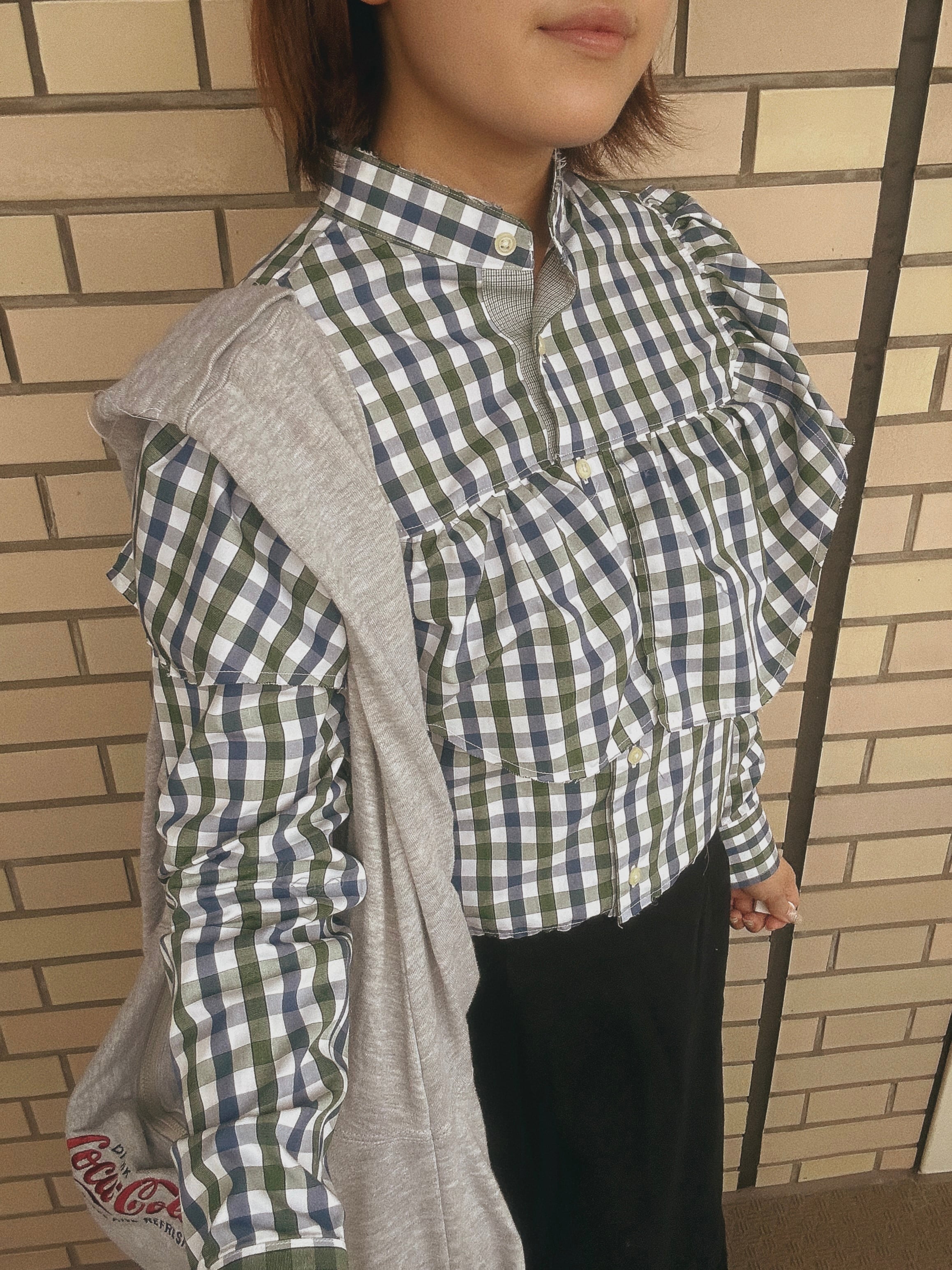 このフリルは、シャツの裾部分を切り取り、丁寧に縫い合わせることで生まれました。遊び心あるデザインでありながら、フリルのボリュームが視線を上に集め、スタイルアップ効果も期待できます。