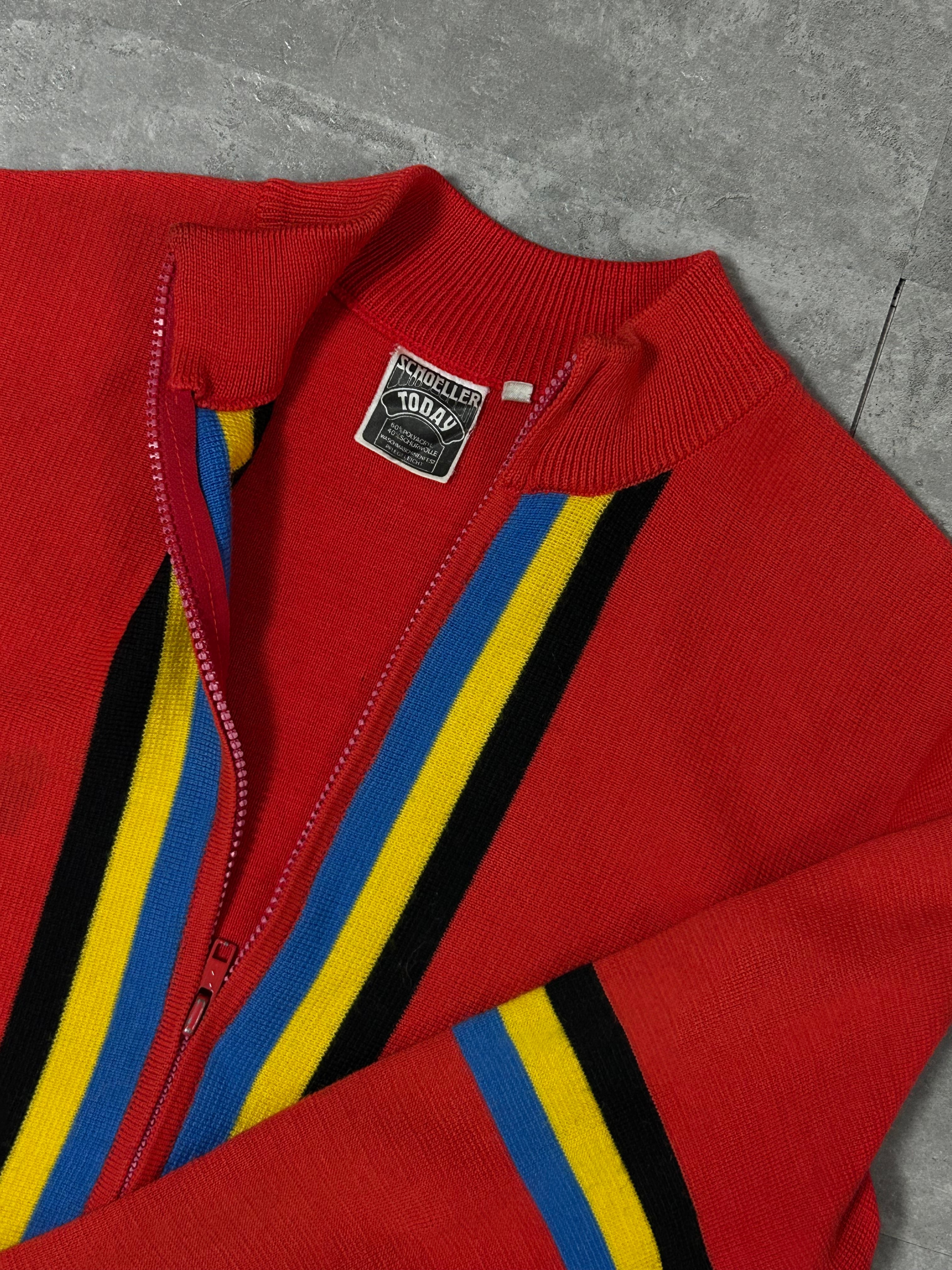 ビビッドなレッドを基調に、ブラック・イエロー・ブルーのラインがフロントと袖に入ったジップアップニットトップス。